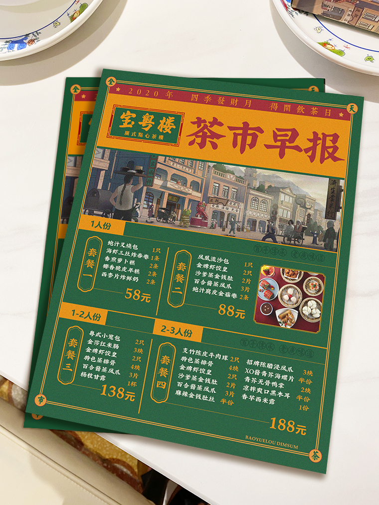 寶粵樓:百年傳承的老廣味道,點(diǎn)心單除了具備點(diǎn)餐的功能,還應(yīng)表達(dá)品牌歷史和底蘊(yùn)。寶粵樓的茶樓市井氣息濃厚,點(diǎn)心單只選取部分產(chǎn)品圖片,刻意傳達(dá)一種古舊的老茶樓氣息;茶市早報(bào)的創(chuàng)意設(shè)計(jì),則將老廣人嘆早茶,看報(bào)紙的生活場景再次還原,極有趣味性之余更把品牌帶入歷史年代中。