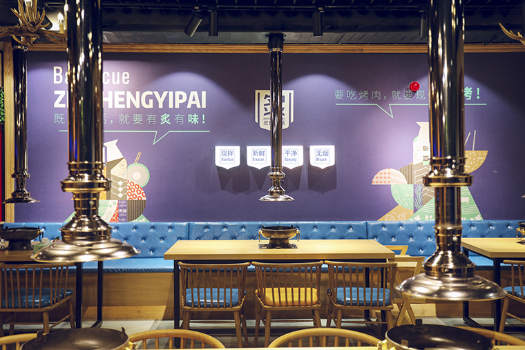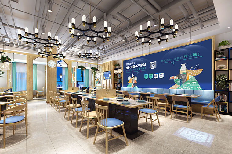 3、家具軟裝:家具是餐飲室內環境的重要部分,因為占地面積大,并且與顧客的接觸最為密切。所以,家具的造型和色彩對餐廳的整體氛圍起著極其重要的影響。炙成一派的家具選擇了與品牌色接近的天藍色,椅子的款項選擇新中式的梳背圈椅,舒適度高,且與整體的空間氛圍極為相稱。其他軟裝如花藝,小包枕,窗簾等,體現空間藝術裝飾性及舒適度之余,還具有趣味性和品牌軟性宣傳。