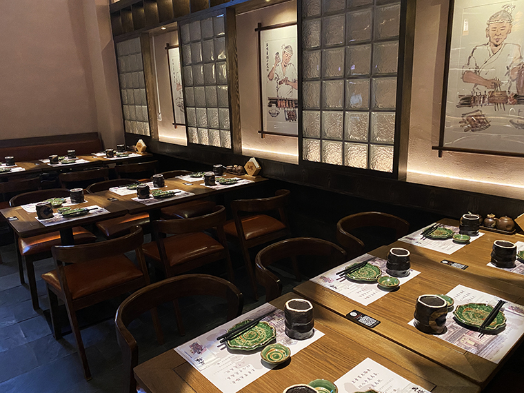 如:品深餐飲全案策劃設(shè)計(jì)的玉椿燒鳥居酒屋,設(shè)計(jì)師通過國(guó)畫手繪小品的形式展示燒鳥的制作過程,巧妙的結(jié)合在形象墻上,消費(fèi)者在享受美食的同時(shí),也理解了燒鳥的知識(shí)從而記住了玉椿燒鳥品牌。