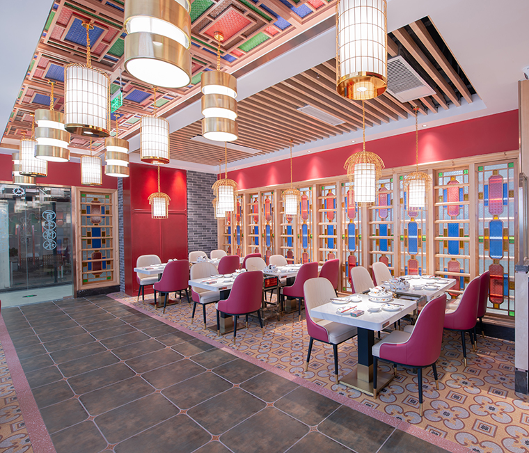 廣式花窗,又稱為滿洲窗。源自于廣州最開始與外國開展海外貿(mào)易,是典型的舶來品。滿洲窗不同的款式和花紋組合體現(xiàn)了使用者的生活富足與審美情趣。廣式花窗可以很好的表現(xiàn)廣式點(diǎn)心茶樓的品類屬性,具有一目了然,一見如故的特性。在寶粵樓的空間設(shè)計中,我們將廣式花窗大面積使用門口兩側(cè)的主形象,包房隔斷、甚至天花吊頂上,形成了強(qiáng)烈的視覺沖擊力,具有鮮明的老廣州西關(guān)韻味。