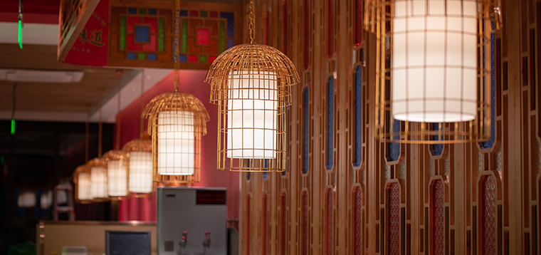 此次寶粵樓的空間軟裝陳列設(shè)計,涵蓋了餐桌餐椅、收銀臺、服務(wù)臺、收納柜、沙發(fā)坐具等餐飲家具;空間吊燈及照明裝飾設(shè)計;裝飾品、雕塑擺件、工藝品、畫藝軟裝以及最重要的品牌定制裝置軟裝。家具的主色調(diào)與品牌的主色調(diào)保持一致,椅子的款型也選用了廣州西關(guān)老式茶樓中的椅子;我們所使用的吊燈模仿鳥籠造型就是為了傳遞廣州老茶客提籠遛鳥飲早茶的悠閑幸福生活,和整個品牌文化高度契合;