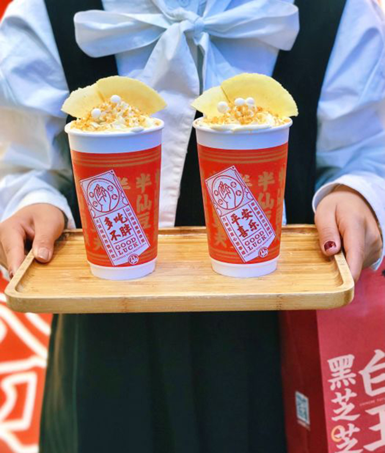 注重儀式感,豆漿出品前用一串日本白玉丸子橫在杯子上,并撒上豆粉,儀式感滿滿,白玉丸子蘸上香濃豆粉與奶蓋,先吃軟糯白玉串燒,再喝綿密的豆乳奶蓋,成功地把豆漿變成能吃的豆乳茶,引來顧客爭相拍照打卡,一時間成為網紅產品。