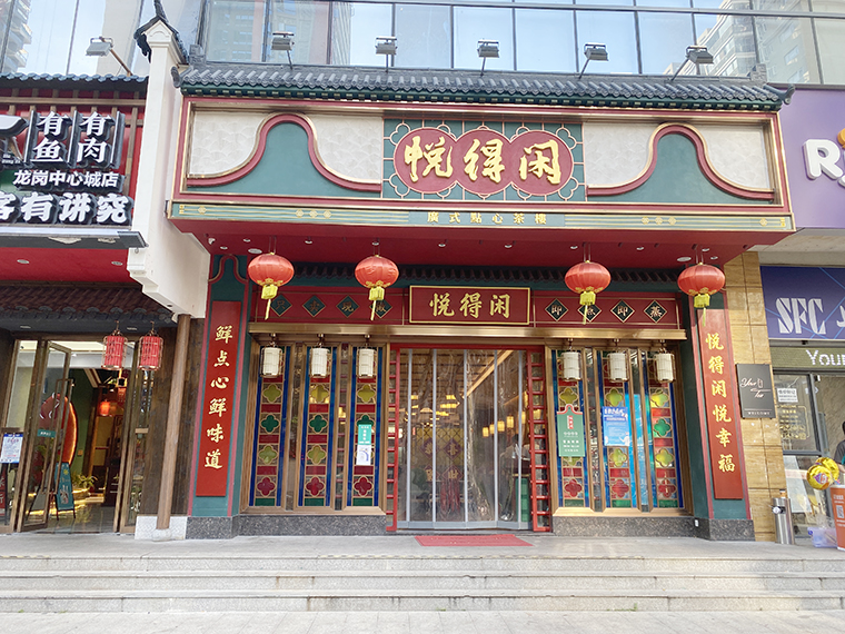 悅得閑-廣式點(diǎn)心茶樓,品深在策劃時(shí)將其定位為一家經(jīng)典時(shí)尚的廣式點(diǎn)心茶樓。門頭色彩搭配、對(duì)聯(lián)、玻璃窗花都用了廣式元素,并大膽使用紅綠兩色撞色搭配,形成品牌記憶點(diǎn)。