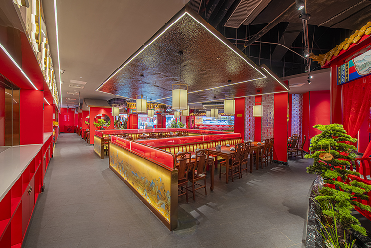 1、本項目為京味張東莞大朗碧桂園里悅里店,總面積約829平方米。用中國紅強化品牌內含的北京皇城文化,令人印象鮮明;
