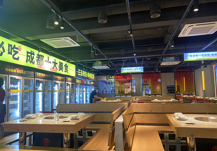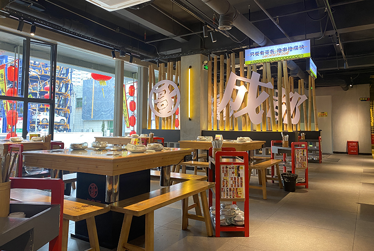 品深餐飲全案團隊專程去成都體驗了很多家串串香火鍋店,發現不少串串香火鍋藏在街頭巷尾,空間環境狹小閉窄,收納功能做得很差,各種物料都是亂放亂堆,美其名曰是煙火氣,現場感受是臟亂差,用餐非常難受。所以我們在設計規劃鹵串哥的門店時,座位分布上,8人卡座與4人散臺相結合,座椅的尺度比例比常規串串香寬闊了很多,流轉效率更高,翻臺率也更高了。