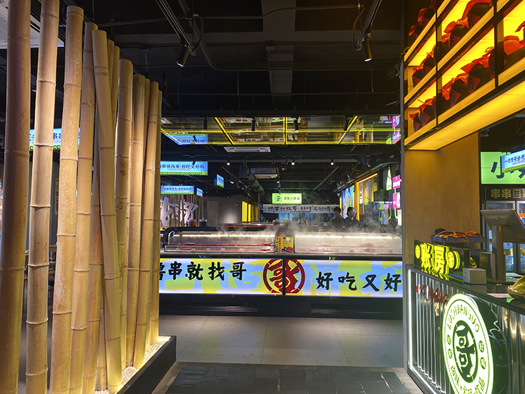 品深將其設計出連續長排展示,讓顧客有一種想征服美食的欲望。鹵串哥堅持的是串串每日新鮮現串,這是鹵串哥菜品的顯著特點,我們將其設計成明檔,命名為:串串吃法研修堂。讓顧客對新鮮能親眼所見。